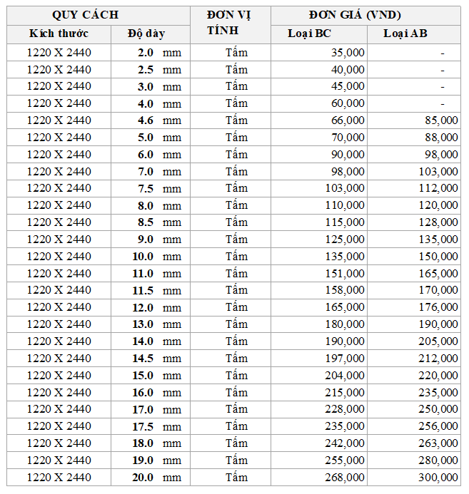 Dưới đây là bảng giá chi tiết của ván ép bao bì, ván gỗ thông dụng nhât hiện nay: